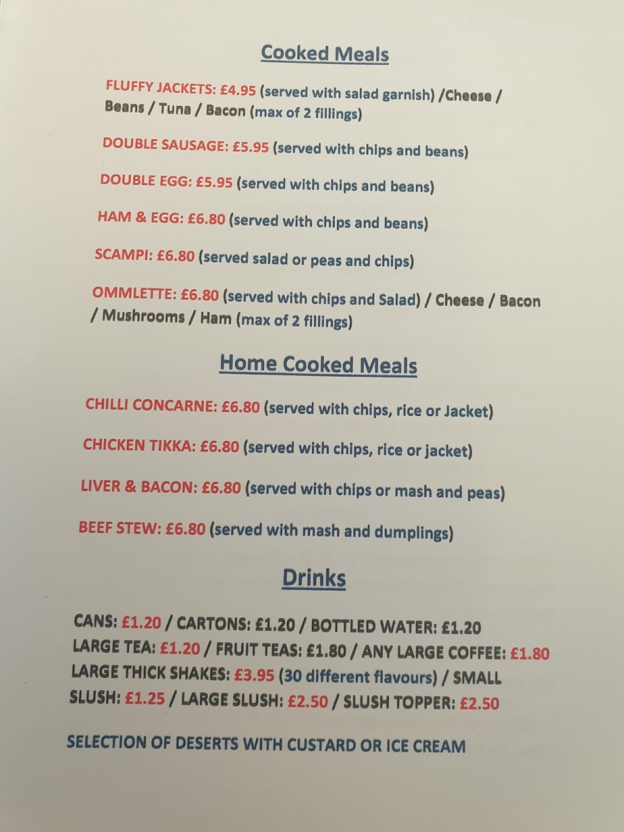 Among the highlights of the menu are the Fluffy Jackets and savory Double Sausage dishes, which promise comfort in every bite. If you prefer something heartier, indulge in their Chicken Tikka or the ever-popular Beef Stew, each crafted with care reminiscent of home-cooked delights. The drink selection is equally satisfying, featuring everything from refreshing Large Thick Shakes to a variety of teas.